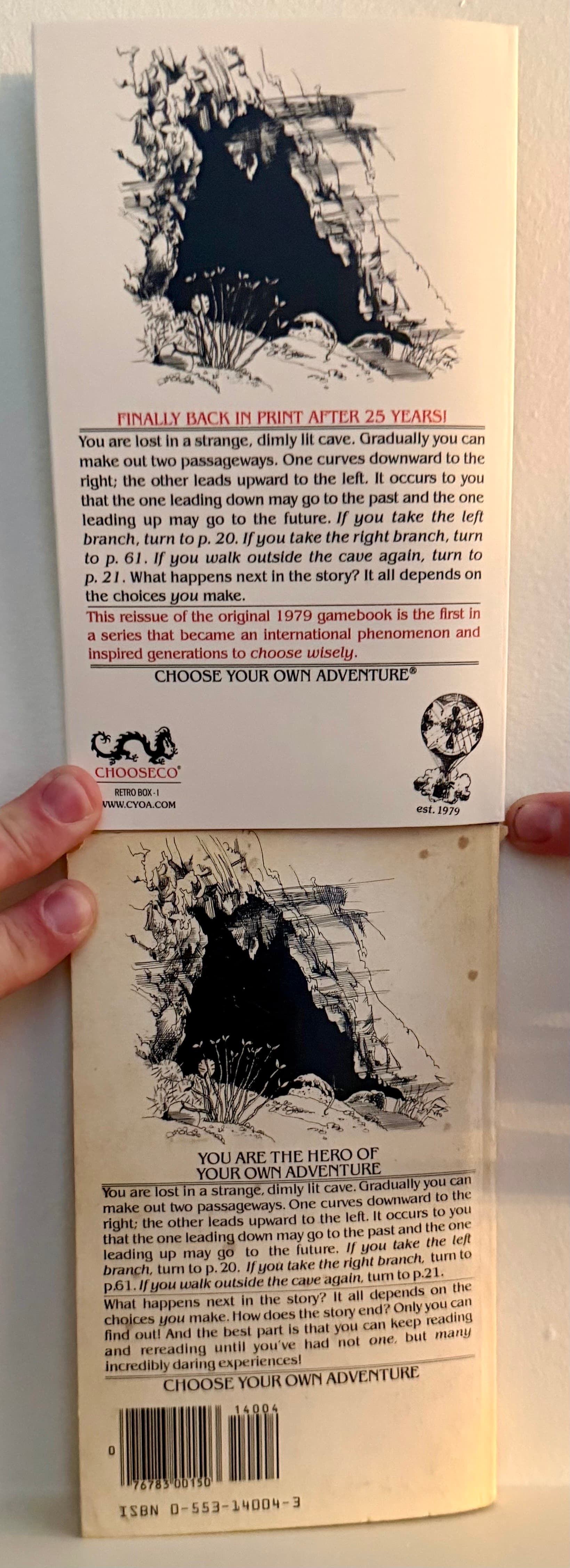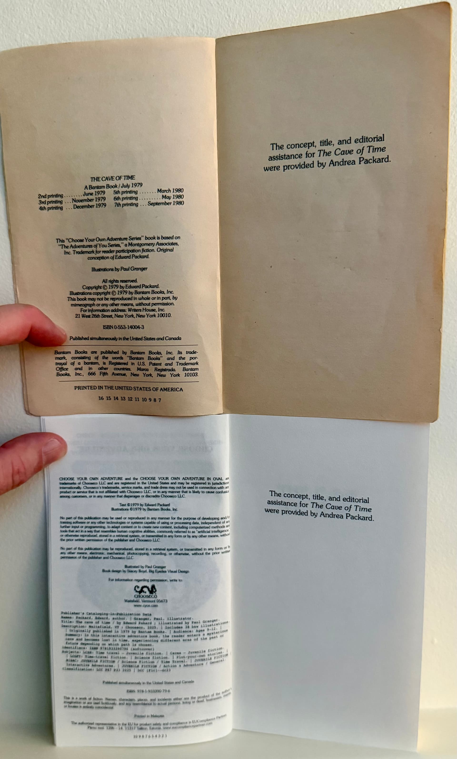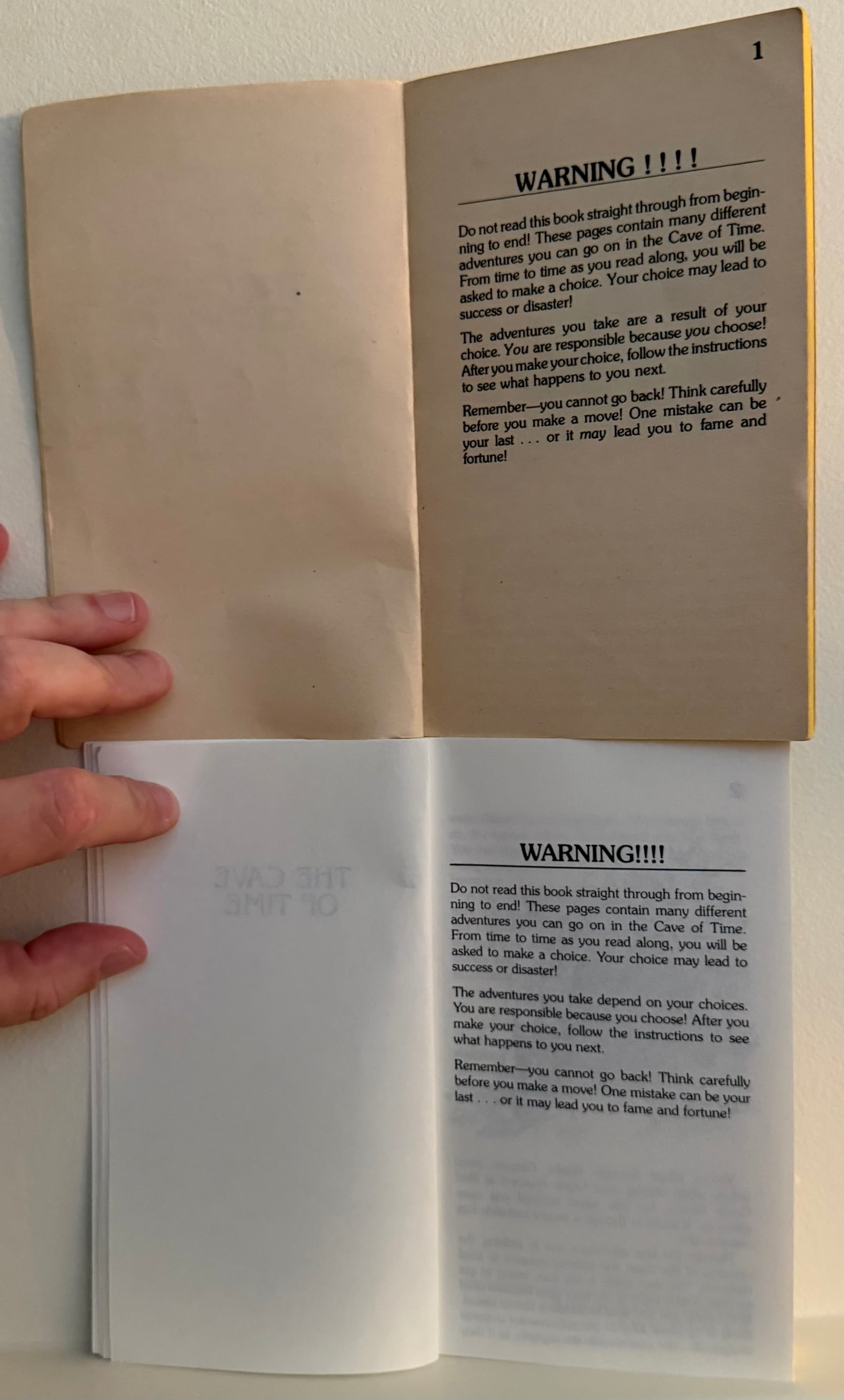 Here’s a comparison of the recently (2025) reissued classic Choose Your Own Adventure book collection (1-4) with my original copy of Cave of Time from when I was a kid around age 8, kept by my mom.. she recently sent it to me, so I did a quick comparison, all the front pages up to page 5.