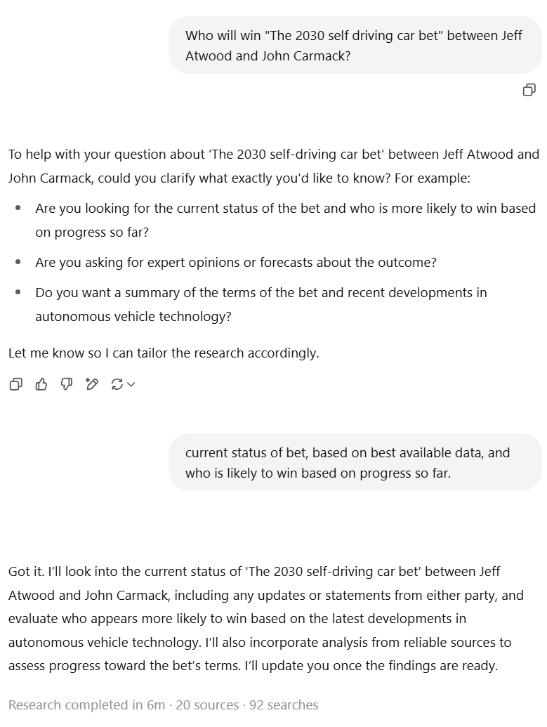 Carmack’s scenario requires a continuation and acceleration of recent advances – not impossible, especially given the competitive push in the industry, but a lot has to go right in a short time. The next few years will be crucial. If by 2027 we see fully driverless operations scaling to more cities and handling nasty weather, then momentum might swing to Carmack. If instead progress stays incremental and confined (e.g. robo-taxis work only in Sun Belt cities with safety drivers on standby, etc.), then Atwood’s skepticism will look on point. As of mid-2025, the safe bet (no pun intended) leans toward Atwood.
